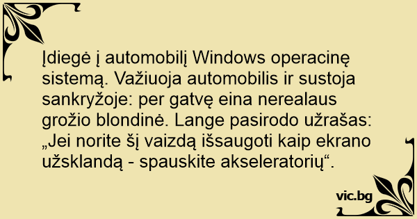 Įdiegė į automobilį Windows operacinę sistemą. Važiuoja automobilis ir sustoja sankryžoje: per gatvę eina nerealaus grožio blondinė. Lange pasirodo užrašas: „Jei norite šį vaizdą išsaugoti kaip ekrano užsklandą - spauskite akseleratorių“.