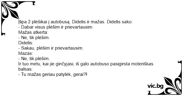Ir tuo metu, kai jie ginčyjasi, iš galo autobuso pasigirsta moteriškas balsas: