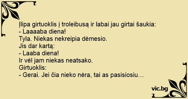 Įlipa girtuoklis į troleibusą ir labai jau girtai šaukia: