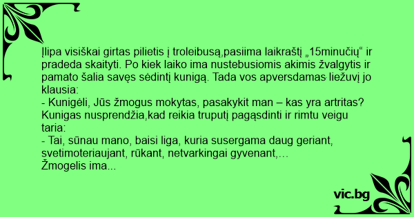 Įlipa visiškai girtas pilietis į troleibusą,pasiima laikraštį „15minučių“ ir pradeda skaityti. Po kiek laiko ima nustebusiomis akimis žvalgytis ir pamato šalia savęs sėdintį kunigą. Tada vos apversdamas liežuvį jo klausia: