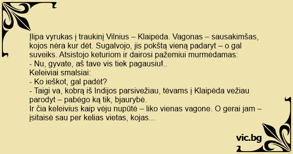 - Kokia dar Klaipėda!? Kažkoks debilas gyvatę paleido, tai visą vagoną atkabino. Jau trys valandos ieškom…