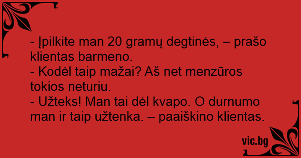 - Įpilkite man 20 gramų degtinės, – prašo klientas barmeno.