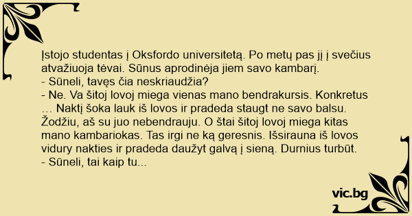 - Ne. Va šitoj lovoj miega vienas mano bendrakursis. Konkretus … Naktį šoka lauk iš lovos ir pradeda staugt ne savo balsu. Žodžiu, aš su juo nebendrauju. O štai šitoj lovoj miega kitas mano kambariokas. Tas irgi ne ką geresnis. Išsirauna iš lovos vidury nakties ir pradeda daužyt galvą į sieną. Durnius turbūt.