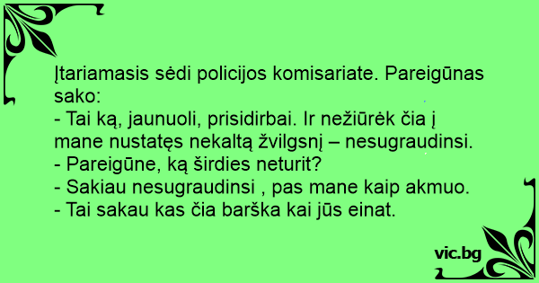Įtariamasis sėdi policijos komisariate. Pareigūnas sako: