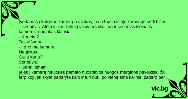 Įvedamas į kalėjimo kamerą naujokas, na o toje pačioje kameroje sėdi bičas – senbūvis. Atėjo laikas kalinių laisvam laikui, na ir senbūvis išeina iš kameros, naujokas klausia: