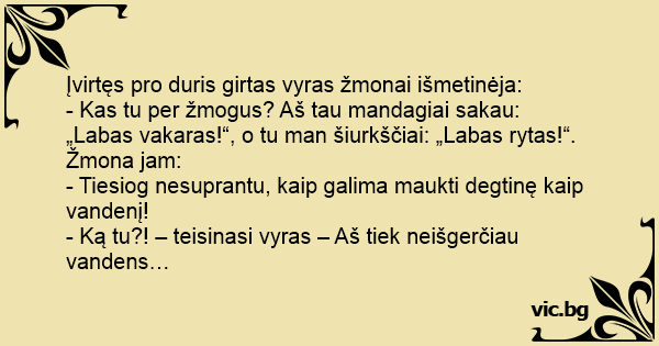 - Kas tu per žmogus? Aš tau mandagiai sakau: „Labas vakaras!“, o tu man šiurkščiai: „Labas rytas!“.