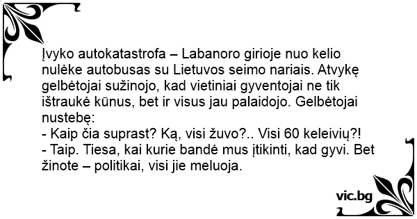 Įvyko autokatastrofa – Labanoro girioje nuo kelio nulėke autobusas su Lietuvos seimo nariais. Atvykę gelbėtojai sužinojo, kad vietiniai gyventojai ne tik ištraukė kūnus, bet ir visus jau palaidojo. Gelbėtojai nustebę: