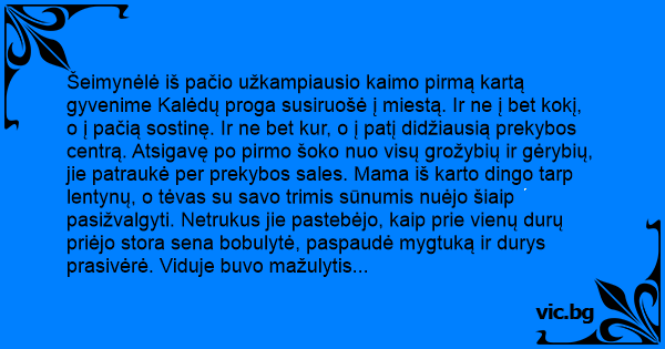 Šeimynėlė iš pačio užkampiausio kaimo pirmą kartą gyvenime Kalėdų proga susiruošė į miestą. Ir ne į bet kokį, o į pačią sostinę. Ir ne bet kur, o į patį didžiausią prekybos centrą. Atsigavę po pirmo šoko nuo visų grožybių ir gėrybių, jie patraukė per prekybos sales. Mama iš karto dingo tarp lentynų, o tėvas su savo trimis sūnumis nuėjo šiaip pasižvalgyti. Netrukus jie pastebėjo, kaip prie vienų durų priėjo stora sena bobulytė, paspaudė mygtuką ir durys prasivėrė. Viduje buvo mažulytis kambarėlis be jokių langų ir kitų durų. Kai durys vėl užsidarė, virš jų ant sienos sumirksėjo skaičiukai nuo vieno iki devynių ir po kiek laiko atgal iki vieno. Durys vėl prasiskyrė, ir vyrų apatiniai žandikauliai iš nuostabos nusileido iki pat krūtinės. Iš to kambariuko išėjo stulbinančio grožio mergina, metė niekingą žvilgsnį į apstulbusius kaimiečius ir nuskubėjo į prekybos salę. Tėvas drebančia ranka sugriebė vyriausiojo sūnaus petį ir sukomandavo:
