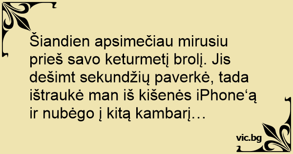 Šiandien apsimečiau mirusiu prieš savo keturmetį brolį. Jis dešimt sekundžių paverkė, tada ištraukė man iš kišenės iPhone‘ą ir nubėgo į kitą kambarį…