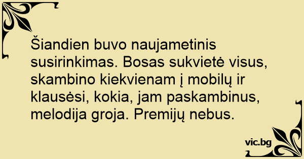 Šiandien buvo naujametinis susirinkimas. Bosas sukvietė visus, skambino kiekvienam į mobilų ir klausėsi, kokia, jam paskambinus, melodija groja. Premijų nebus.