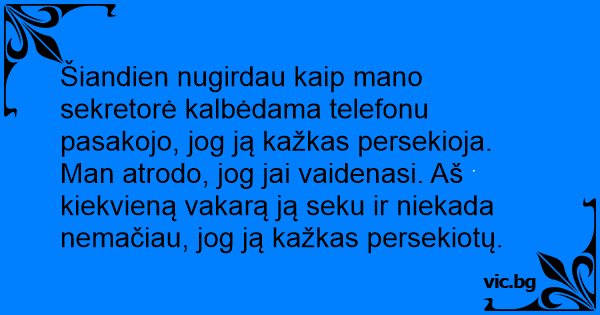 Šiandien nugirdau kaip mano sekretorė kalbėdama telefonu pasakojo, jog ją kažkas persekioja. Man atrodo, jog jai vaidenasi. Aš kiekvieną vakarą ją seku ir niekada nemačiau, jog ją kažkas persekiotų.