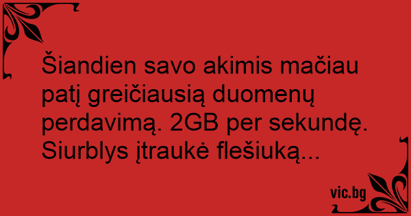 Šiandien savo akimis mačiau patį greičiausią duomenų perdavimą. 2GB per sekundę. Siurblys įtraukė flešiuką...