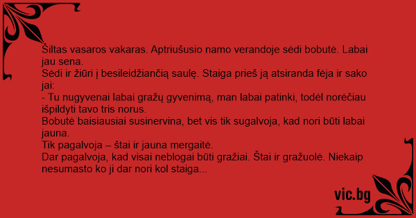 Šiltas vasaros vakaras. Aptriušusio namo verandoje sėdi bobutė. Labai jau sena.