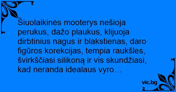 Šiuolaikinės mooterys nešioja perukus, dažo plaukus, klijuoja dirbtinius nagus ir blakstienas, daro figūros korekcijas, tempia raukšles, švirkščiasi silikoną ir vis skundžiasi, kad neranda idealaus vyro…