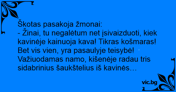 - Žinai, tu negalėtum net įsivaizduoti, kiek kavinėje kainuoja kava! Tikras košmaras! Bet vis vien, yra pasaulyje teisybė! Važiuodamas namo, kišenėje radau tris sidabrinius šaukštelius iš kavinės…