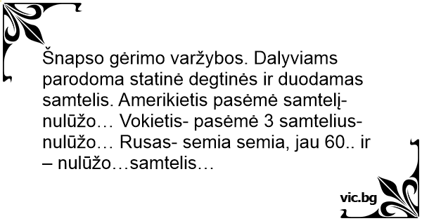 Šnapso gėrimo varžybos. Dalyviams parodoma statinė degtinės ir duodamas samtelis. Amerikietis pasėmė samtelį- nulūžo… Vokietis- pasėmė 3 samtelius- nulūžo… Rusas- semia semia, jau 60.. ir – nulūžo…samtelis…