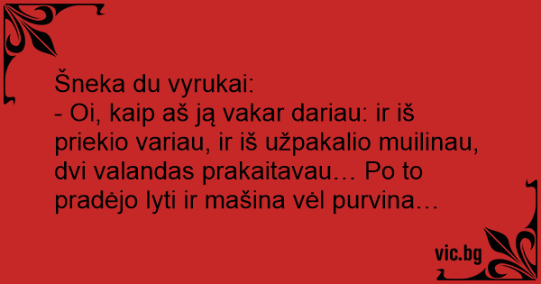 - Oi, kaip aš ją vakar dariau: ir iš priekio variau, ir iš užpakalio muilinau, dvi valandas prakaitavau… Po to pradėjo lyti ir mašina vėl purvina…