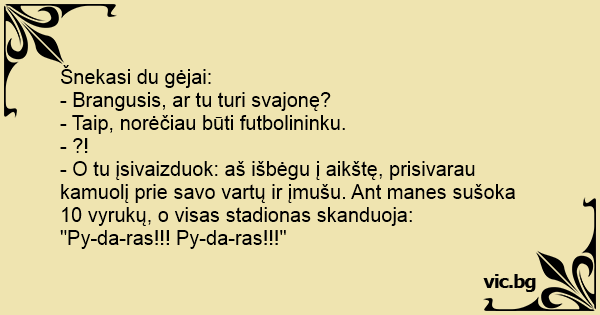 - O tu įsivaizduok: aš išbėgu į aikštę, prisivarau kamuolį prie savo vartų ir įmušu. Ant manes sušoka 10 vyrukų, o visas stadionas skanduoja: