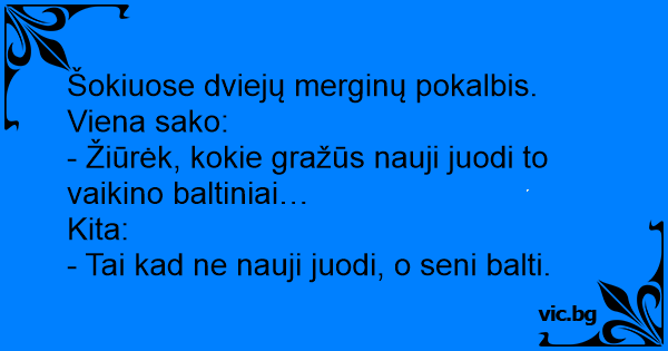 Šokiuose dviejų merginų pokalbis. Viena sako:
