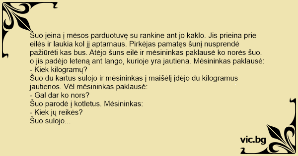 Šuo du kartus sulojo ir mėsininkas į maišėlį įdėjo du kilogramus jautienos. Vėl mėsininkas paklausė: