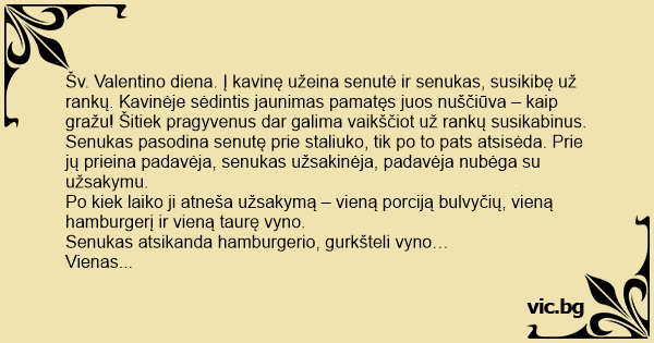 Šv. Valentino diena. Į kavinę užeina senutė ir senukas, susikibę už rankų. Kavinėje sėdintis jaunimas pamatęs juos nuščiūva – kaip gražu! Šitiek pragyvenus dar galima vaikščiot už rankų susikabinus.