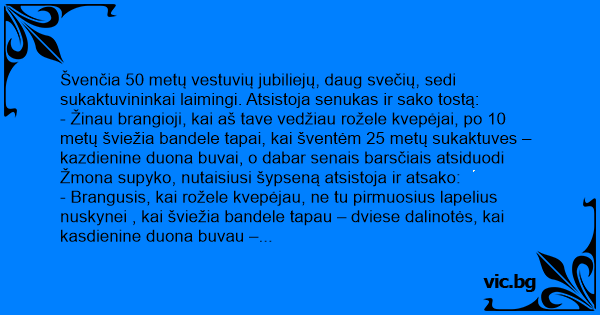 Švenčia 50 metų vestuvių jubiliejų, daug svečių, sedi sukaktuvininkai laimingi. Atsistoja senukas ir sako tostą: