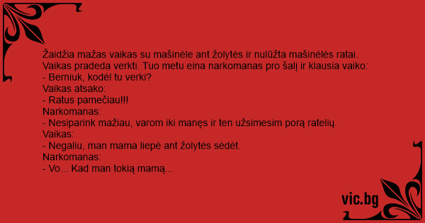 Žaidžia mažas vaikas su mašinėle ant žolytės ir nulūžta mašinėlės ratai. Vaikas pradeda verkti. Tuo metu eina narkomanas pro šalį ir klausia vaiko: