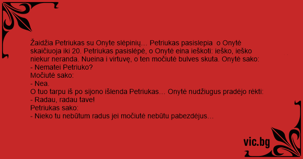 Žaidžia Petriukas su Onyte slėpinių… Petriukas pasislepia o Onytė skaičiuoja iki 20. Petriukas pasislėpė, o Onytė eina ieškoti: ieško, ieško niekur neranda. Nueina i virtuvę, o ten močiutė bulves skuta. Onytė sako: