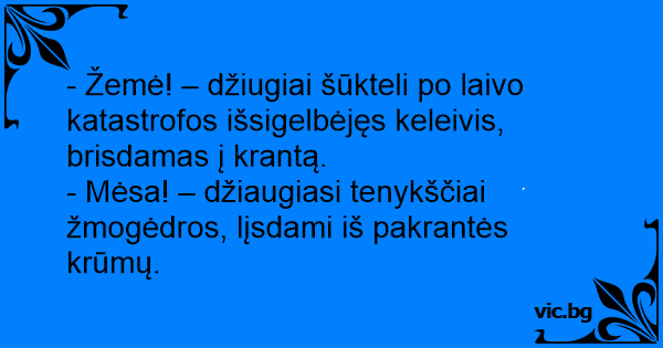 - Žemė! – džiugiai šūkteli po laivo katastrofos išsigelbėjęs keleivis, brisdamas į krantą.