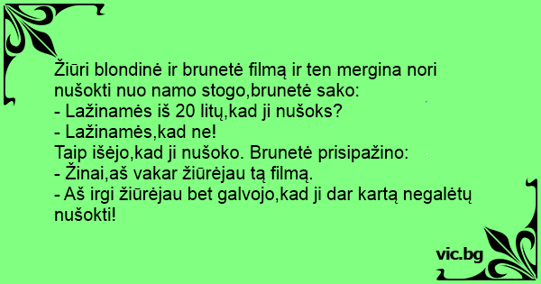Žiūri blondinė ir brunetė filmą ir ten mergina nori nušokti nuo namo stogo,brunetė sako: