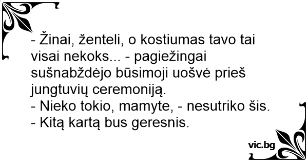 - Žinai, ženteli, o kostiumas tavo tai visai nekoks... - pagiežingai sušnabždėjo būsimoji uošvė prieš jungtuvių ceremoniją.