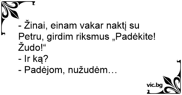 - Žinai, einam vakar naktį su Petru, girdim riksmus „Padėkite! Žudo!“