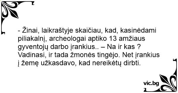 - Žinai, laikraštyje skaičiau, kad, kasinėdami piliakalnį, archeologai aptiko 13 amžiaus gyventojų darbo įrankius.. – Na ir kas ?