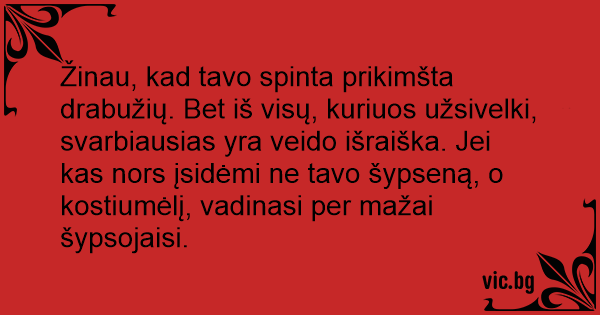 Žinau, kad tavo spinta prikimšta drabužių. Bet iš visų, kuriuos užsivelki, svarbiausias yra veido išraiška. Jei kas nors įsidėmi ne tavo šypseną, o kostiumėlį, vadinasi per mažai šypsojaisi.