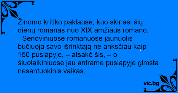 - Senoviniuose romanuose jaunuolis bučiuoja savo išrinktąją ne anksčiau kaip 150 puslapyje, – atsakė šis, – o šiuolaikiniuose jau antrame puslapyje gimsta nesantuokinis vaikas.