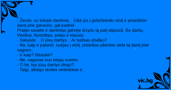 - Žinote, su tokiais dantimis... Eikit jūs į geležinkelio stotį ir prisiriškite dantį prie garvežio, gal padės!