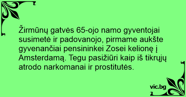 Žirmūnų gatvės 65-ojo namo gyventojai susimetė ir padovanojo, pirmame aukšte gyvenančiai pensininkei Zosei kelionę į Amsterdamą. Tegu pasižiūri kaip iš tikrųjų atrodo narkomanai ir prostitutės.
