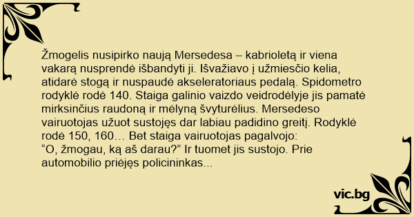 Žmogelis nusipirko naują Mersedesa – kabrioletą ir viena vakarą nusprendė išbandyti ji. Išvažiavo į užmiesčio kelia, atidarė stogą ir nuspaudė akseleratoriaus pedalą. Spidometro rodyklė rodė 140. Staiga galinio vaizdo veidrodėlyje jis pamatė mirksinčius raudoną ir mėlyną švyturėlius. Mersedeso vairuotojas užuot sustojęs dar labiau padidino greitį. Rodyklė rodė 150, 160… Bet staiga vairuotojas pagalvojo: