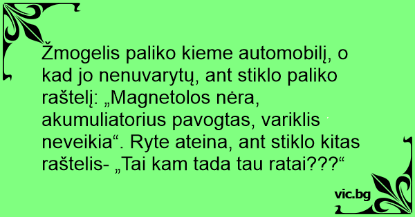 Žmogelis paliko kieme automobilį, o kad jo nenuvarytų, ant stiklo paliko raštelį: „Magnetolos nėra, akumuliatorius pavogtas, variklis neveikia“. Ryte ateina, ant stiklo kitas raštelis- „Tai kam tada tau ratai???“