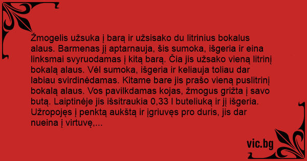 Žmogelis užsuka į barą ir užsisako du litrinius bokalus alaus. Barmenas jį aptarnauja, šis sumoka, išgeria ir eina linksmai svyruodamas į kitą barą. Čia jis užsako vieną litrinį bokalą alaus. Vėl sumoka, išgeria ir keliauja toliau dar labiau svirdinėdamas. Kitame bare jis prašo vieną puslitrinį bokalą alaus. Vos pavilkdamas kojas, žmogus grižta į savo butą. Laiptinėje jis išsitraukia 0,33 l buteliuką ir jį išgeria. Užropojęs į penktą aukštą ir įgriuvęs pro duris, jis dar nueina į virtuvę, išsitraukia butelį alaus iš šaldytuvo ir, įsipylęs stiklinę, ją išlenkia iki dugno. Įgriuvęs į miegamąjį, jis pažadina savo žmoną ir sako jai, sunkiai tardamas žodžius: