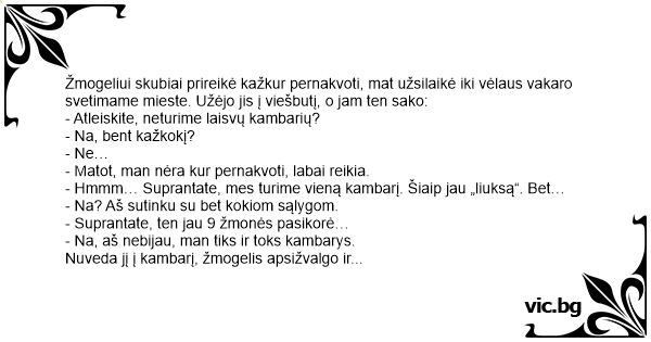 Žmogeliui skubiai prireikė kažkur pernakvoti, mat užsilaikė iki vėlaus vakaro svetimame mieste. Užėjo jis į viešbutį, o jam ten sako: