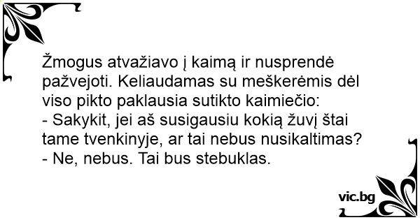 Žmogus atvažiavo į kaimą ir nusprendė pažvejoti. Keliaudamas su meškerėmis dėl viso pikto paklausia sutikto kaimiečio: