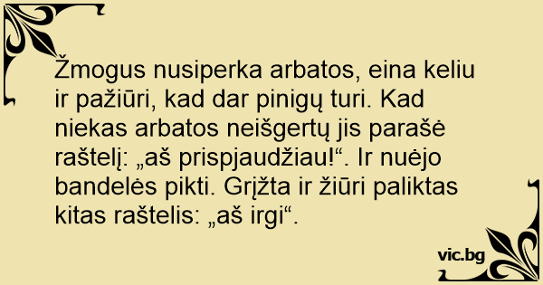 Žmogus nusiperka arbatos, eina keliu ir pažiūri, kad dar pinigų turi. Kad niekas arbatos neišgertų jis parašė raštelį: „aš prispjaudžiau!“. Ir nuėjo bandelės pikti. Grįžta ir žiūri paliktas kitas raštelis: „aš irgi“.