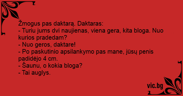 - Turiu jums dvi naujienas, viena gera, kita bloga. Nuo kurios pradedam?