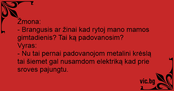 Man: "M'n schoonmoeder is ook een ondankbaar mens!" Vriend: "Hoezo?" Man: "Heb ik gisteren een nieuwe stoel voor haar gekocht, wil ze er niet op gaan zitten!" Vriend: "Wat voor stoel heb je dan... - Ką veiki? - Kėdę uošvei meistrauju! - Daug dar liko? - Ne. Tik elektros darbai. A férj és a feleség vásárolgatnak. A feleség megkérdezi a férjet: - Drágám, holnap lesz anyukám szülinapja. Mit vegyünk neki? Valami elektromos dolgot szeretne. - Mit szólnál egy székhez?