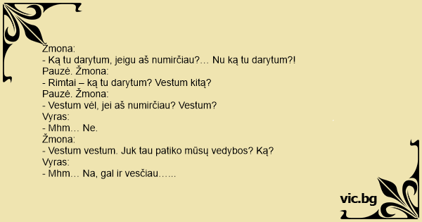 - Ką tu darytum, jeigu aš numirčiau?… Nu ką tu darytum?!