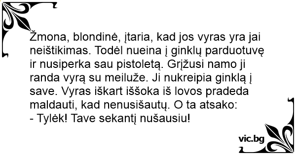 Žmona, blondinė, įtaria, kad jos vyras yra jai neištikimas. Todėl nueina į ginklų parduotuvę ir nusiperka sau pistoletą. Grįžusi namo ji randa vyrą su meiluže. Ji nukreipia ginklą į save. Vyras iškart iššoka iš lovos pradeda maldauti, kad nenusišautų. O ta atsako: