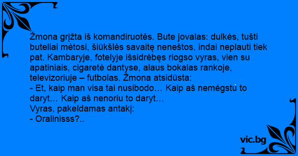 Žmona grįžta iš komandiruotės. Bute jovalas: dulkės, tušti buteliai mėtosi, šiūkšlės savaitę neneštos, indai neplauti tiek pat. Kambaryje, fotelyje išsidrėbęs riogso vyras, vien su apatiniais, cigaretė dantyse, alaus bokalas rankoje, televizoriuje – futbolas. Žmona atsidūsta:
