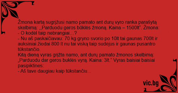 Kitą dieną vyras grįžta namo, ant durų pamato žmonos skelbimą: „Parduodu dar geros buklės vyrą. Kaina: 3lt.“ Vyras baisiai baisiai pasipiktines: