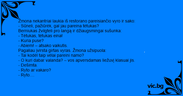 Žmona nekantriai laukia iš restorano pareisiančio vyro ir sako: